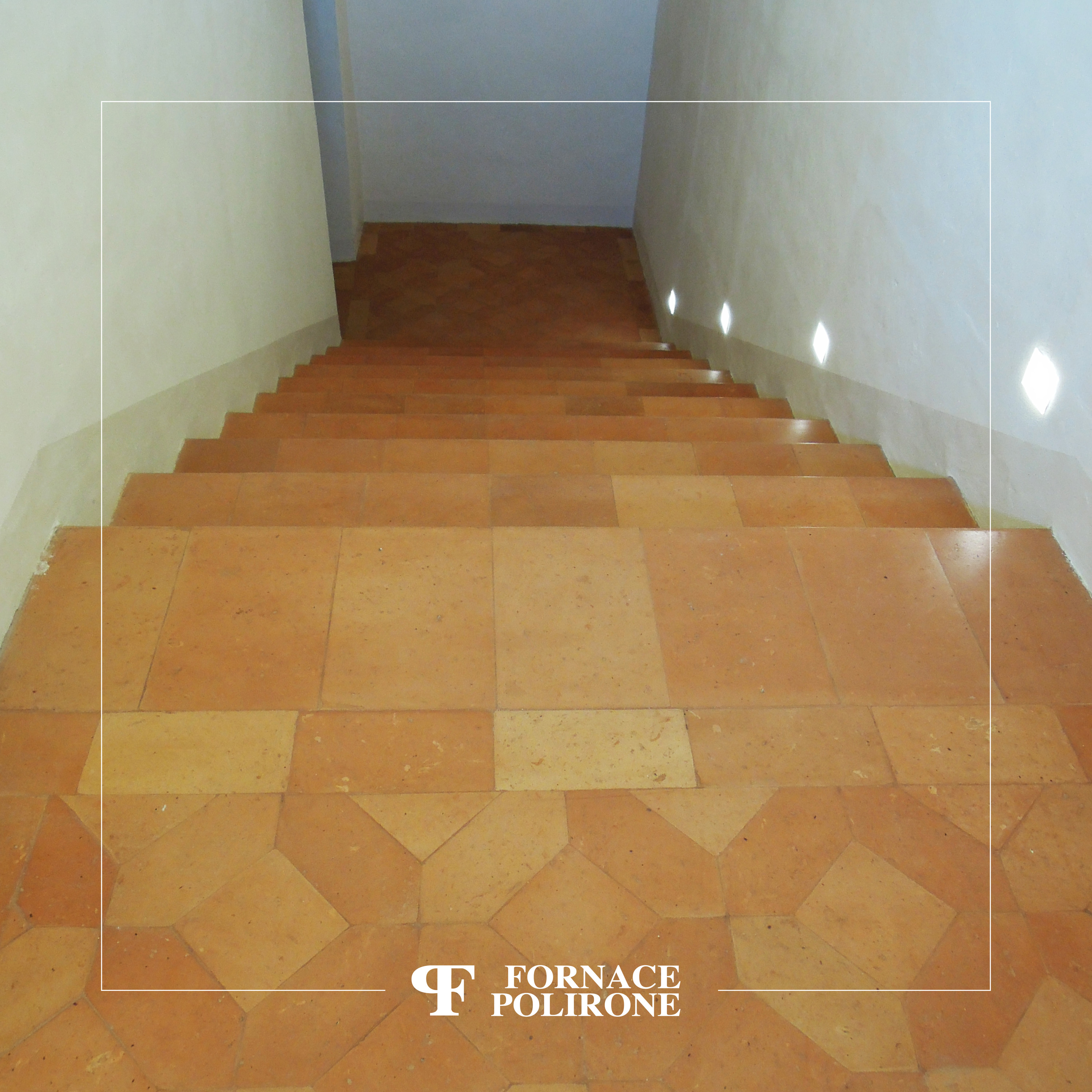 Rifacimento pavimentazione di scala e del pianerottolo in cotto fatto a mano. Composizione di losanghe e quadri nocciolati e stonalizzati, posa ravvicinata.