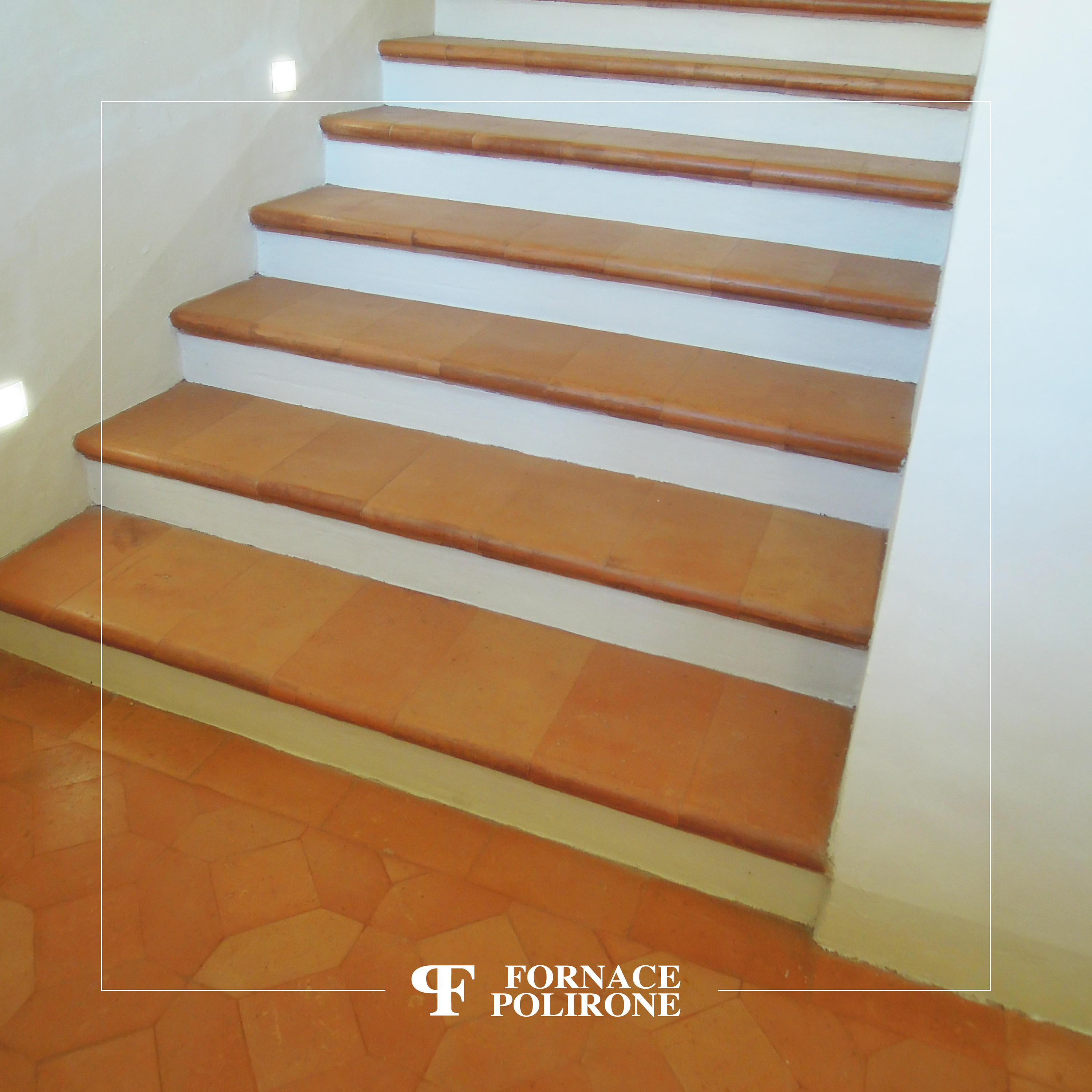 Rifacimento pavimentazione di scala e del pianerottolo in cotto fatto a mano. Composizione di losanghe e quadri nocciolati e stonalizzati, posa ravvicinata.