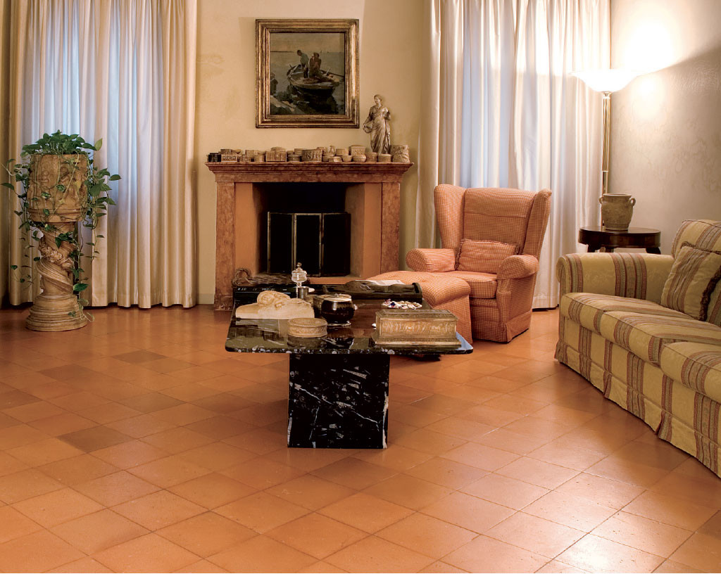 Pavimento in cotto fatto a mano rosato di quadri 25x25, leggermente stonalizzato, posa accostata